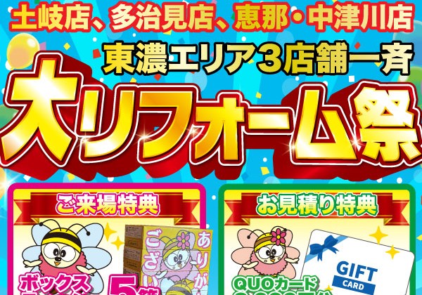 大リフォーム祭開催! リフォームプラザイシグロ可児・美濃加茂店のオープンを記念して、 土岐店、多治見店、恵那・中津川店にて「大リ...