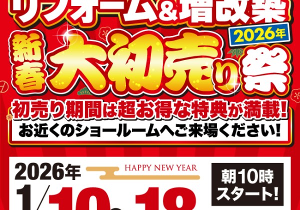 イベント リフォーム 新春大初売り祭開催!【土岐店、多治見店、恵那・中津川店、可... リフォーム&増改築 新春大初売り祭開催! 土岐店、多治見店、恵那・中津川店、可児・美濃加茂店の4店舗合同で、年に一度だけの “新... 2026.01.01