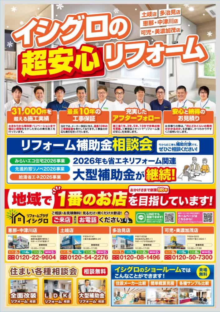 2026年も住宅省エネリフォーム関連の補助金制度が継続されるため、今からの工事でも補助金が活用できます!相談会も実施しておりますので、詳しくはスタッフまでお気軽にお問い合わせください。可児・美濃加茂・土岐・多治見・瑞浪・中津川エリアで安心の地域密着施工なら【リフォームプラザイシグロ】へおまかせ!