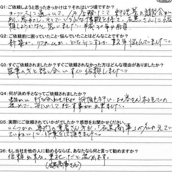 ご依頼しようと思ったきっかけは? 親しくしている方が石黒さんの社員でしたので、ガスの配達をお願いしたのがきっかけで、リフォームな...